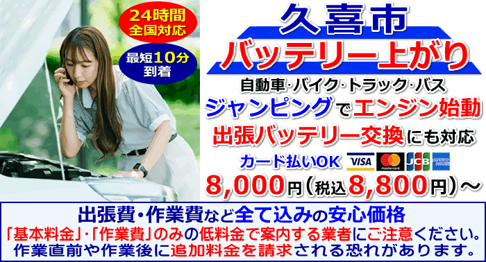 久喜市全域、および久喜市周辺地域でのバッテリー上がりでエンジンがかからない時のジャンピングスタートによるエンジン始動、出張バッテリー交換のご依頼に夜間・深夜、早朝も24時間スピード対応いたします!