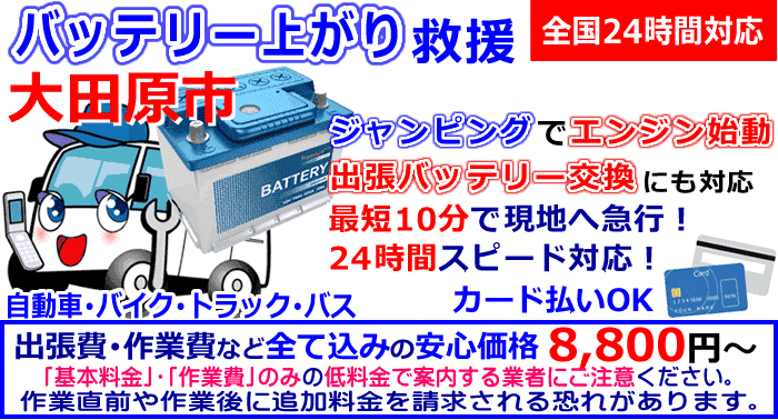 バッテリー上がりは、一番発生する機会の多い車両トラブルです。大田原市のご自宅やお出かけ先にてバッテリー上がりでお困りの際は、お気軽にご連絡ください。全国均一の格安な安心料金にて最短10分現地到着目標で、ご指定いただいた現地に急行します。