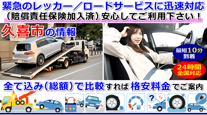 久喜市のレッカー移動/ロードサービス:久喜市全域、久喜市周辺からのご依頼に夜間・深夜、早朝も24時間スピード対応いたします!